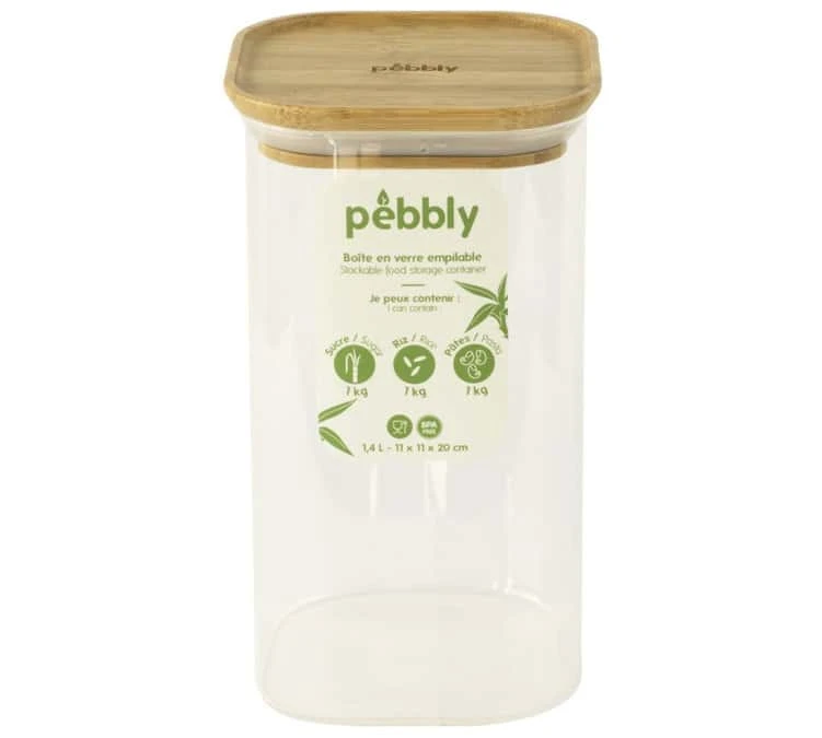 La boîte carrée Pebbly 100% hermétique en verre saura mettre en valeur votre cuisine. Sa contenance de 1.4L ainsi que son couvercle en bambou la rend indispensable. Composée de verre Borosilicate, elle sera plus solide et son couvercle plat à rebord, vous permettra de les empiler pour gagner en place.
